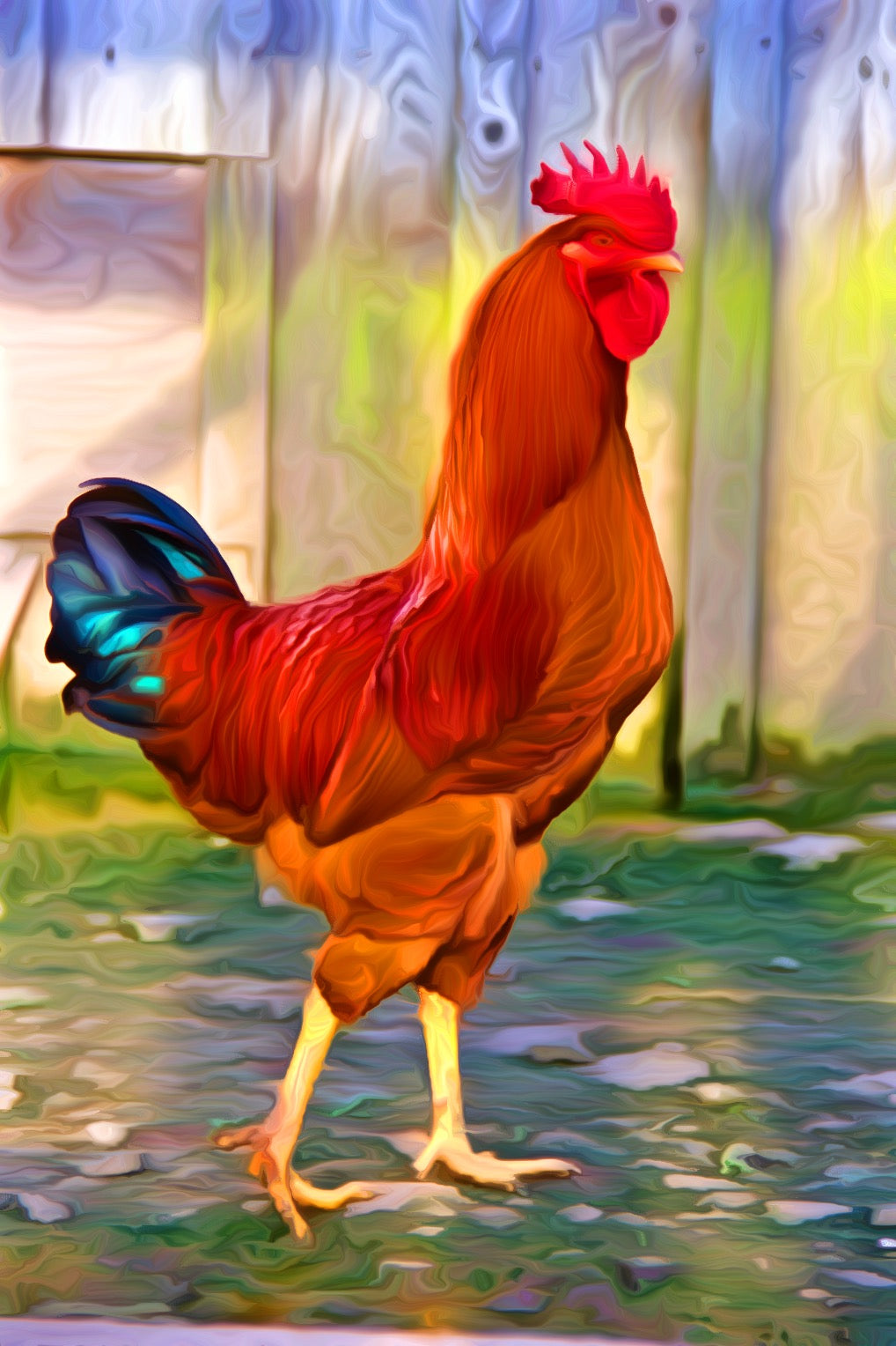 A rooster struts proudly, protecting his flock and overseeing his domain. The detail of karma’s feet touching the ground evokes the feel of grass and soil and stone beneath our own bare feet, and we realize we are not that different, after all.