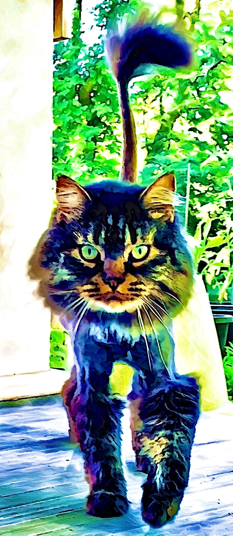 Zendo, the most talkative of our very talkative cats, was found with her three siblings, Babaji, GG, and Viveka, as tiny orphaned kittens. We hand raised them, and may have spoiled them a bit! Zendo is loving and fierce and loyal, with a huge heart and an endearing affectionate side.